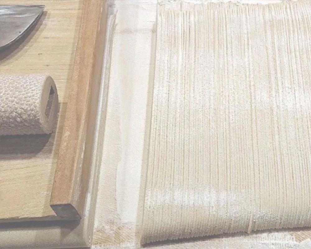 切り(きり)は、手打ちそばの最後の工程で、手際よくリズミカルに切られ、そして切り幅が一定に安定していることです。