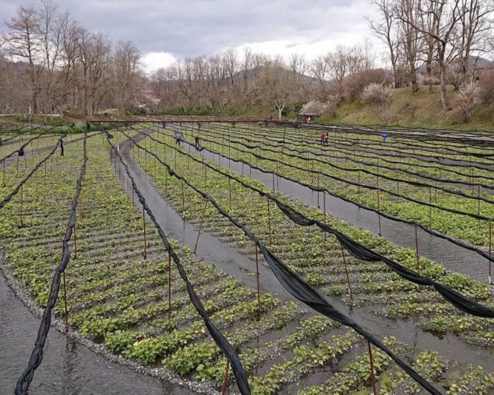安曇野市一帯は、北アルプスの雪解け水が伏流水となり、豊富な湧水と冷涼な気候を生かし約100年前から栽培されている全国1位でその9割を占める安曇野産わさびです。